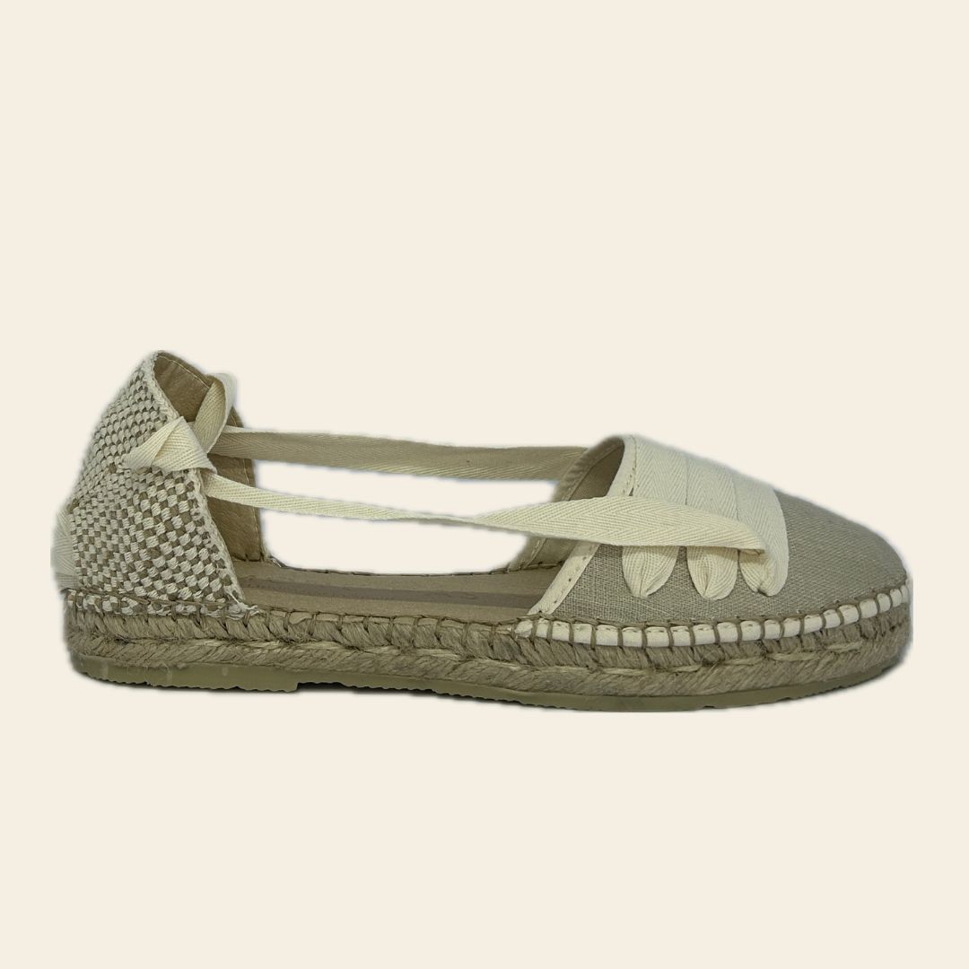 Dali Eucalyptus Espadrilles – Handcrafted in Spain with premium linen in a sophisticated taupe color, paired with matching cream linen pasados and linen laces for an authentic Mediterranean vibe.